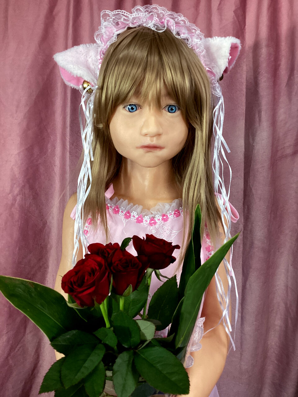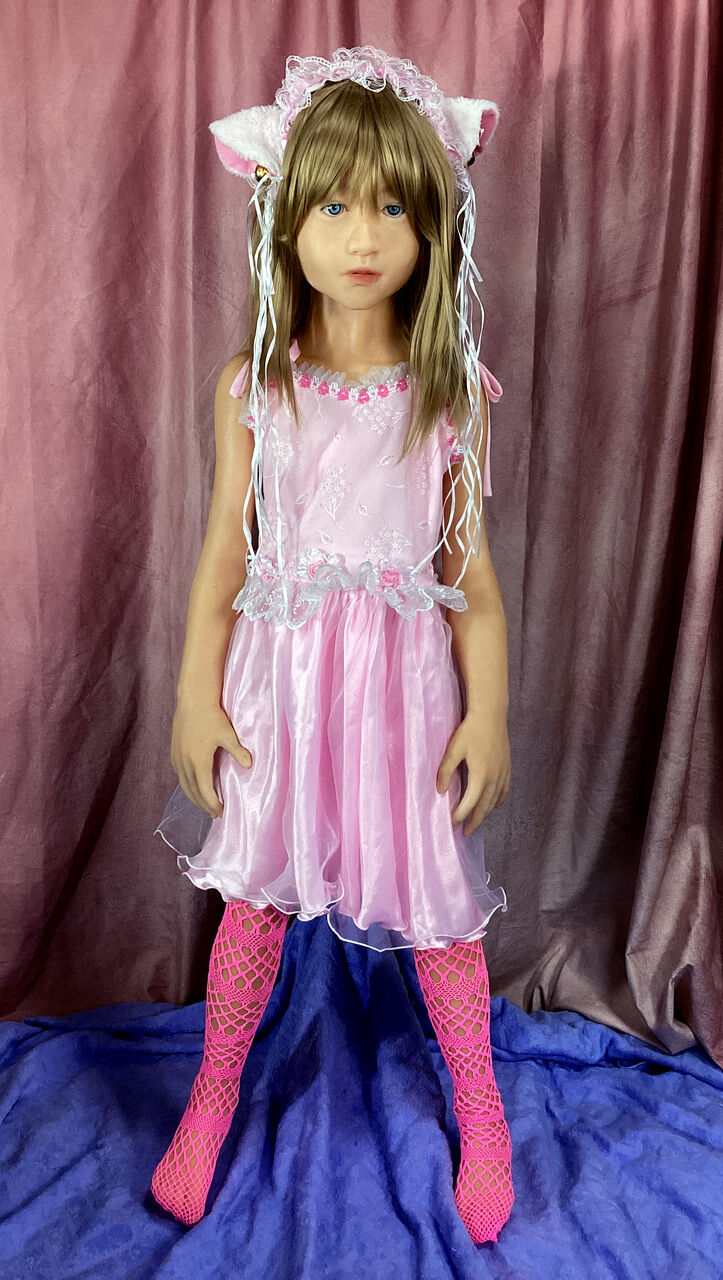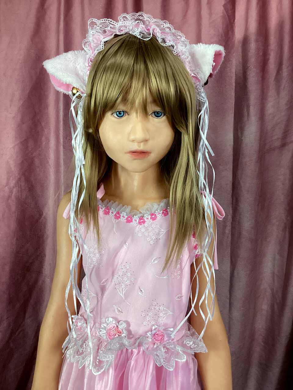 全身。ピンクのドレスに猫耳のカチューシャ。