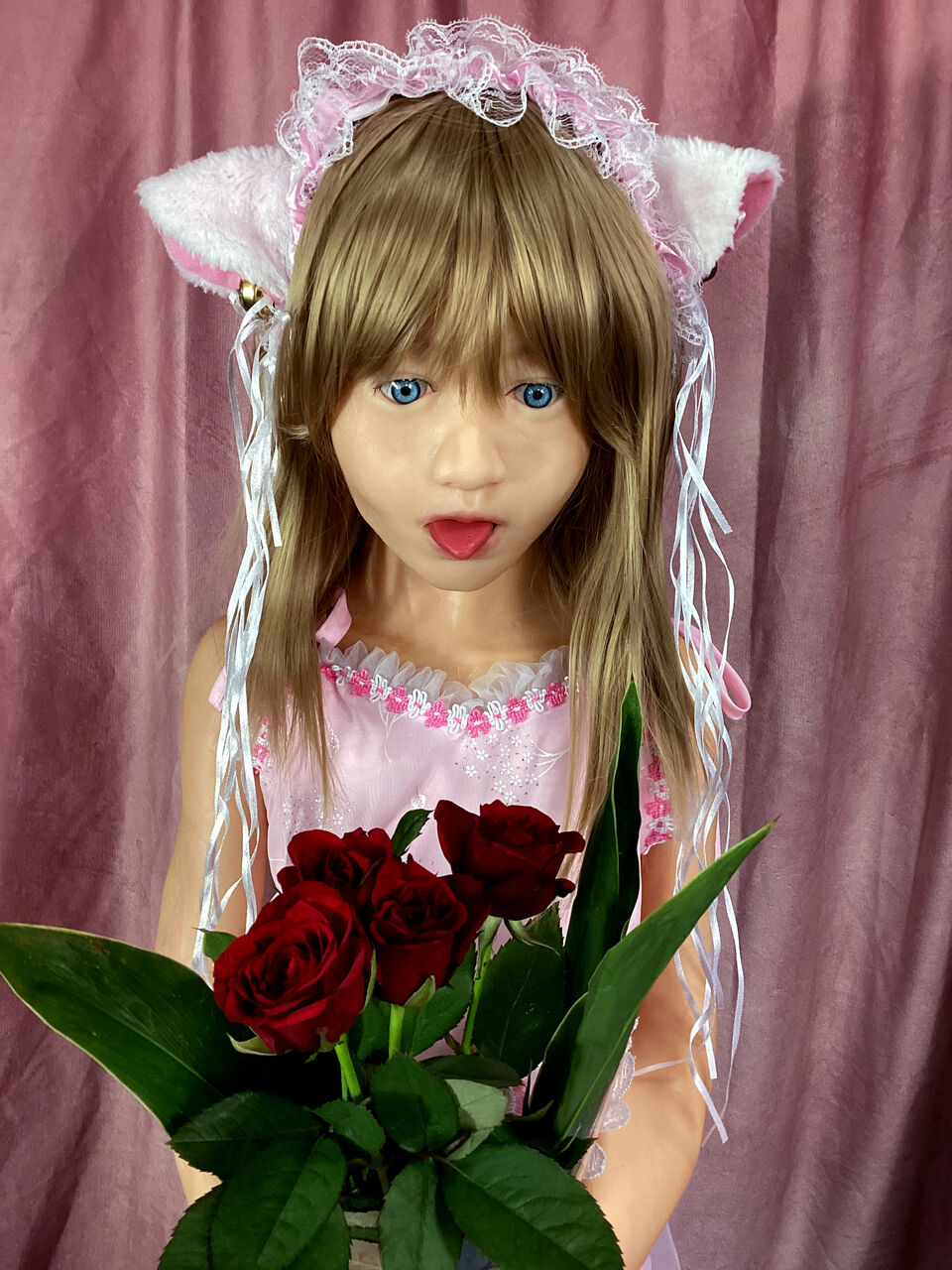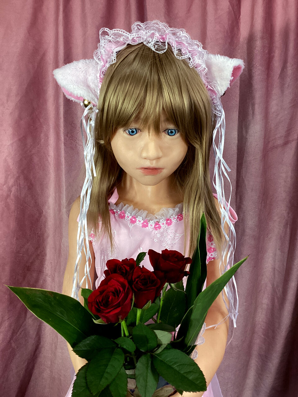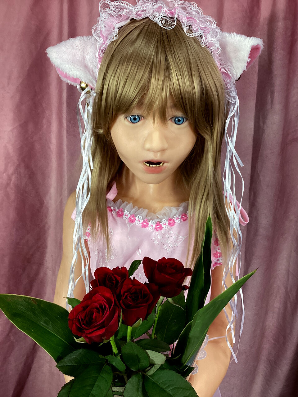 全身。ピンクのドレスに猫耳のカチューシャ。